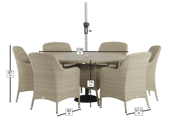 Bramblecrest Tetbury Nutmeg 135cm Round Table with Tree-Free Top & 6 Armchairs with Eco Cushions Parasol & Base