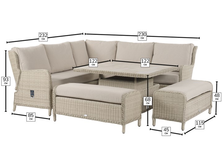 Bramblecrest Chedworth Sandstone Rattan Reclining Corner Sofa with Square Dual Height Table & 2 Benches